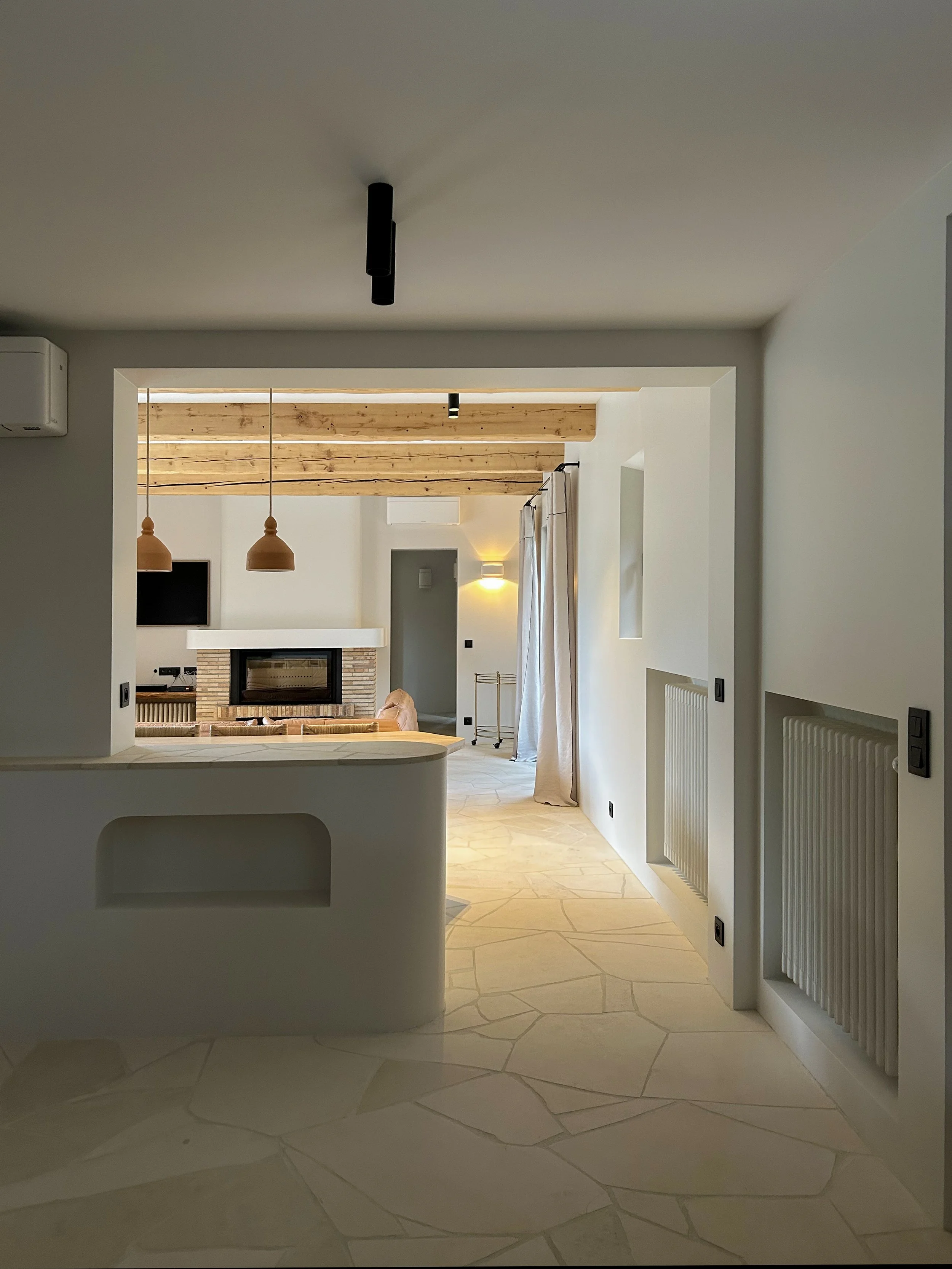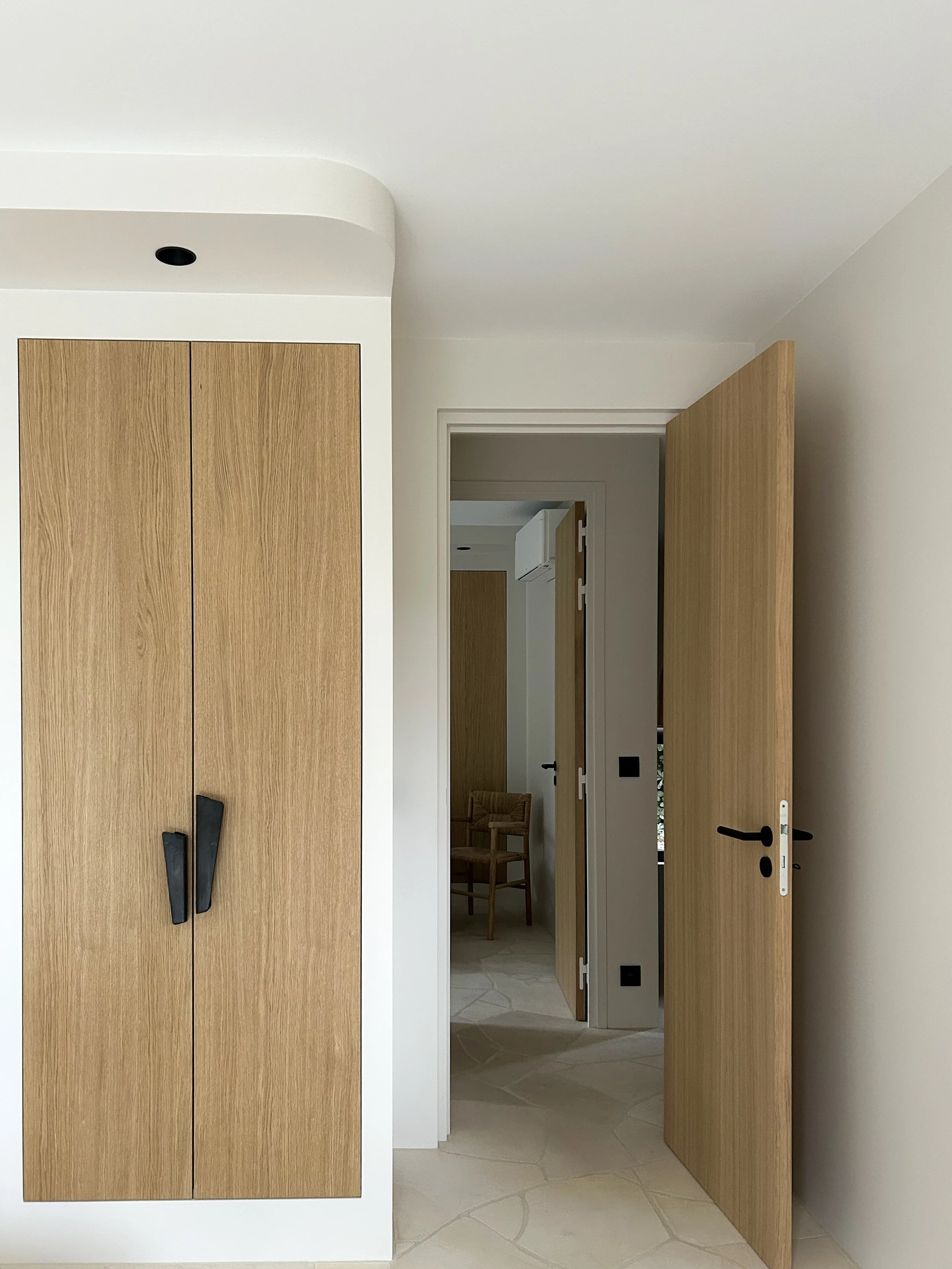 Rénovation totale d’une maison provençale des années 70, située dans le sud de la France. La circulation a été entièrement repensée afin de redéfinir les espaces. L’objectif était d’apporter davantage de luminosité et de créer une véritable atmosphère de vacances. Pour simplifier et épurer l’ensemble, une large part a été accordée à la maçonnerie, avec des angles arrondis dessinés sur mesure. Après l’ouverture des espaces de vie, la cuisine est devenue la pièce maîtresse du projet, sublimée par son îlot rouge provençal. Les sols intérieurs et extérieurs ont été unifiés afin d’agrandir visuellement les volumes. Les deux grandes baies vitrées gris bleuté ont été intégrées dans les murs pour s’effacer complètement. Le résultat offre une ambiance douce et lumineuse, aux tonalités laiteuses, subtilement relevées par la profondeur du rouge..